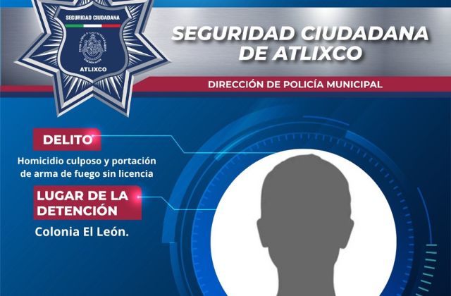 Atlixco, Puebla.– Manteniendo su compromiso por el bienestar de la ciudadanía, la Secretaría de Seguridad Ciudadana (SSC) de Atlixco, informó la detención de un masculino por su probable responsabilidad en el delito de homicidio culposo, así como por la presunta portación de un arma de fuego sin licencia.